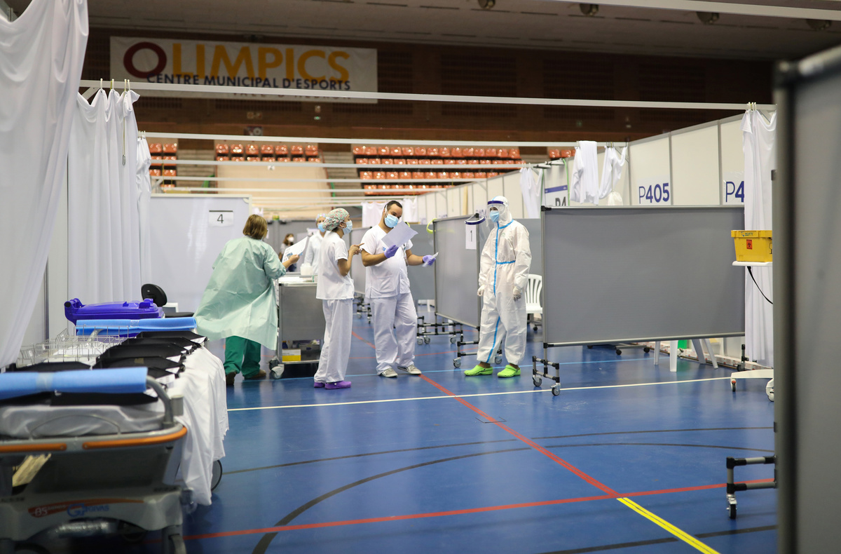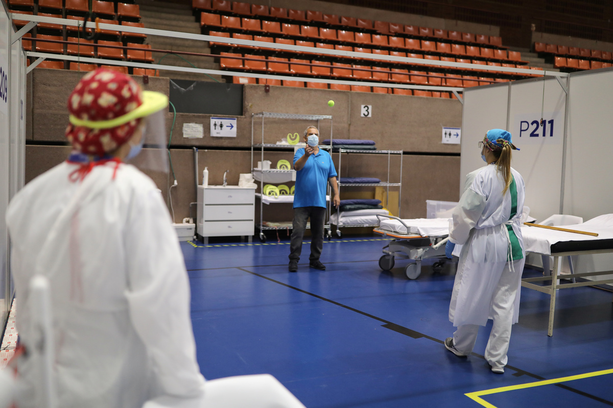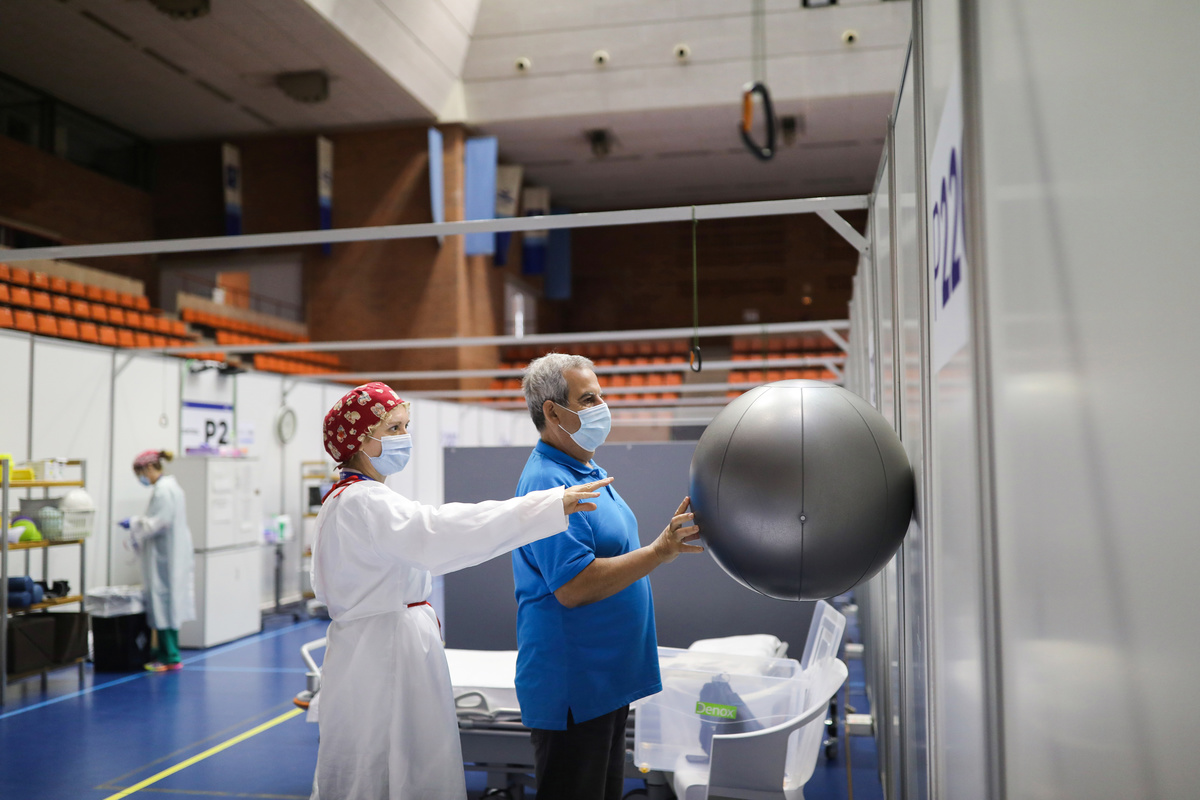 At the Vall d'Hebron facility, a hastily converted sports centre, patients learn to re-use their limbs, gingerly stepping and stretching beneath banks of seats that once held spectators.