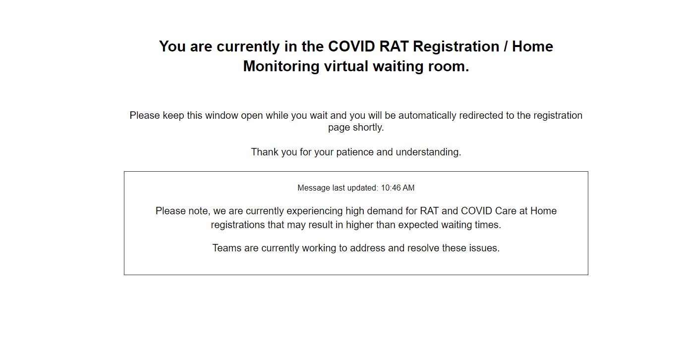 A message on the webpage told people they were "currently in the COVID RAT Registration / Home Monitoring virtual waiting room" and that it was experiencing a high demand for registrations, saying it may result in higher-than-expected waiting times.