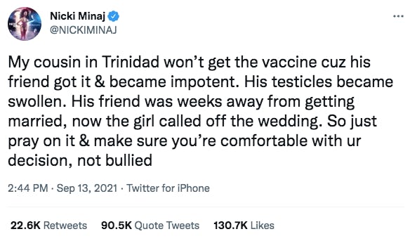 Minaj’s tweet hit upon a sweet spot when it comes to Covid-19 misinformation. It’s a memorable personal anecdote (many vaccine misinformation pages rely on such anecdotes) which relies on a common, but baseless fear: infertility caused by vaccines.