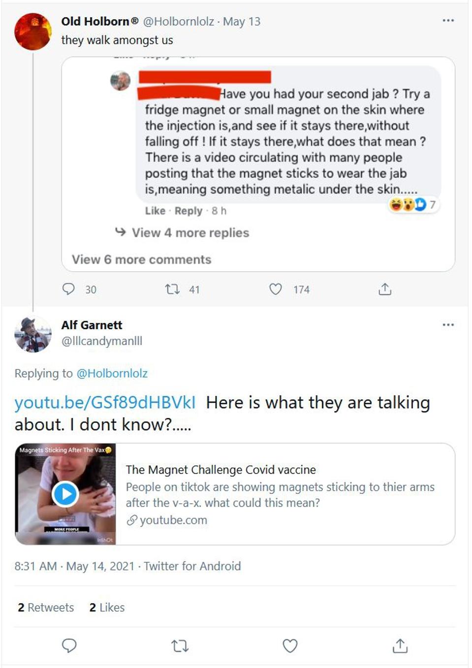 And by “chipped” she presumably didn’t mean potato chipped, banana chipped, poker chipped, cow chipped, or Chip Kelly-d. Instead, in this case, “chipped” probably referred to a metallic microchip, the kind that supposedly can be used to track you. Yes, this whole magnet-sticking-to-arm thing seems to be an extension of the old “tracking microchip in the Covid-19 vaccine” conspiracy theories that have been circulating for a while now.