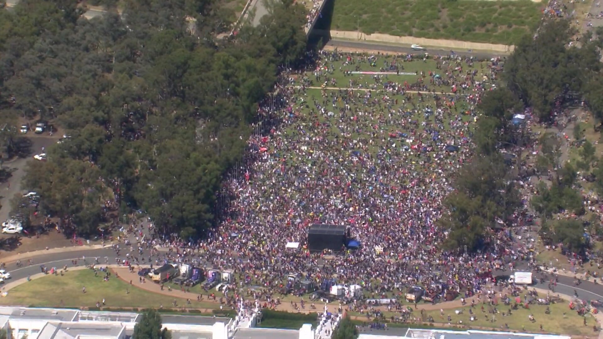 As of 12pm on Saturday, the protesters had gathered on the lawns of Parliament House, and despite warnings from ACT police to stay behind the barricades, at least 100 breached the fence, with police holding their lines by just one metre.
