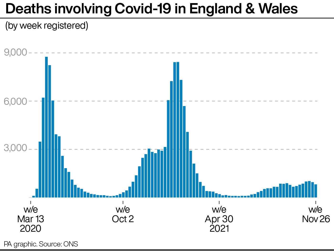 The total number of deaths registered in England and Wales in the week to November 26 was 10.5% above the pre-pandemic five-year average, the ONS said – the equivalent of 1,087 more deaths.