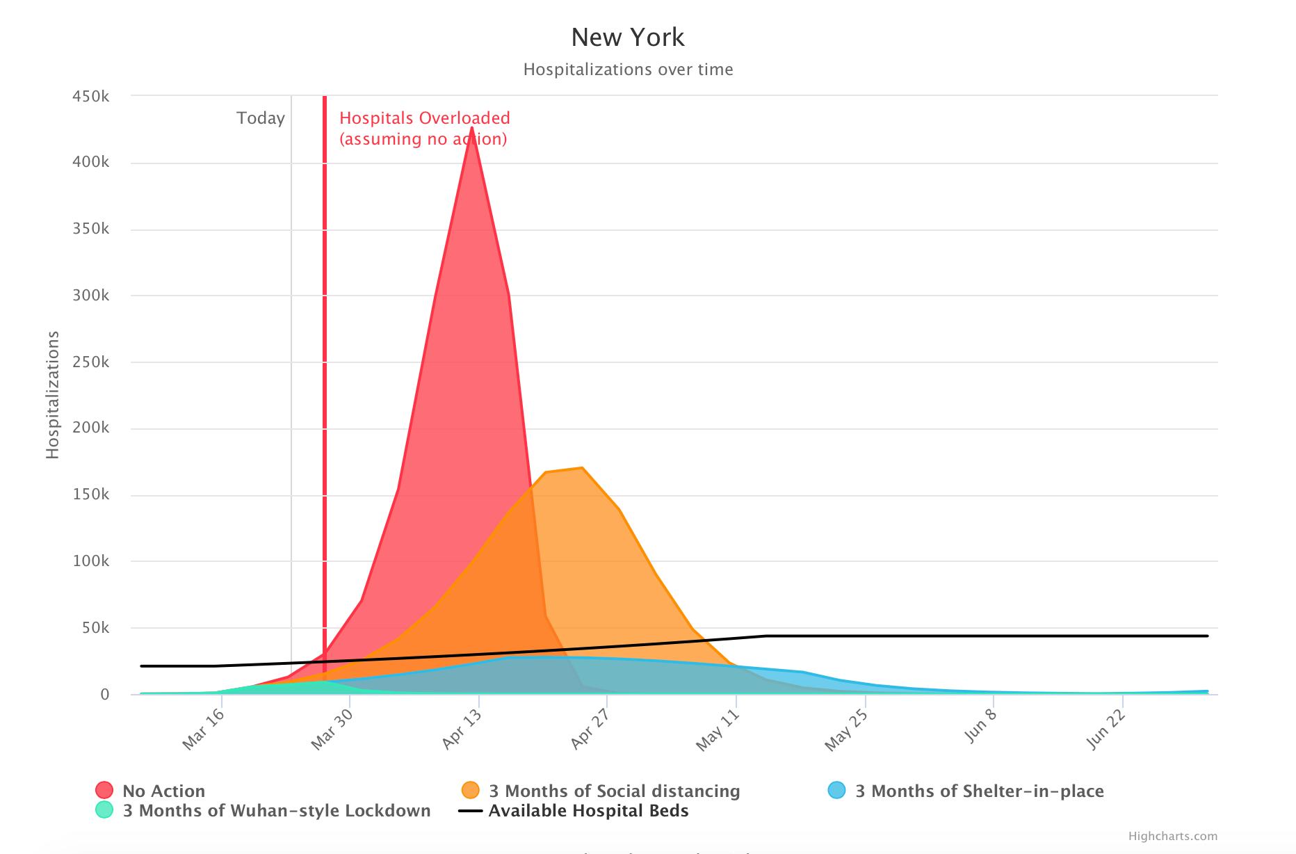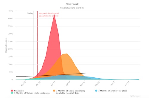 The COVID Act Now map is useful in exactly the ways its creators hoped it would be: in succinctly visualizing how the spread of COVID-19 will affect area hospitals given a variety of scenarios. For each state, the map presents a graph of expected hospitalizations versus the number of available hospital beds at a given time. The point at which hospitals are overwhelmed changes based on the state’s self-isolation and social distancing practices.