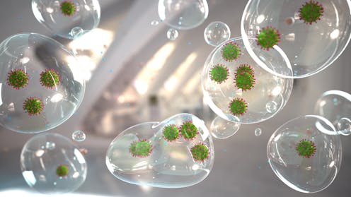 Once exposed to the drier air outside our body, fluid evaporates from the virus-laden larger droplets which then become aerosols – the number of virus particles remains the same, but they are concentrated into a much smaller and lighter aerosol. That means that they can stay suspended in the air for hours and pose an infection risk.