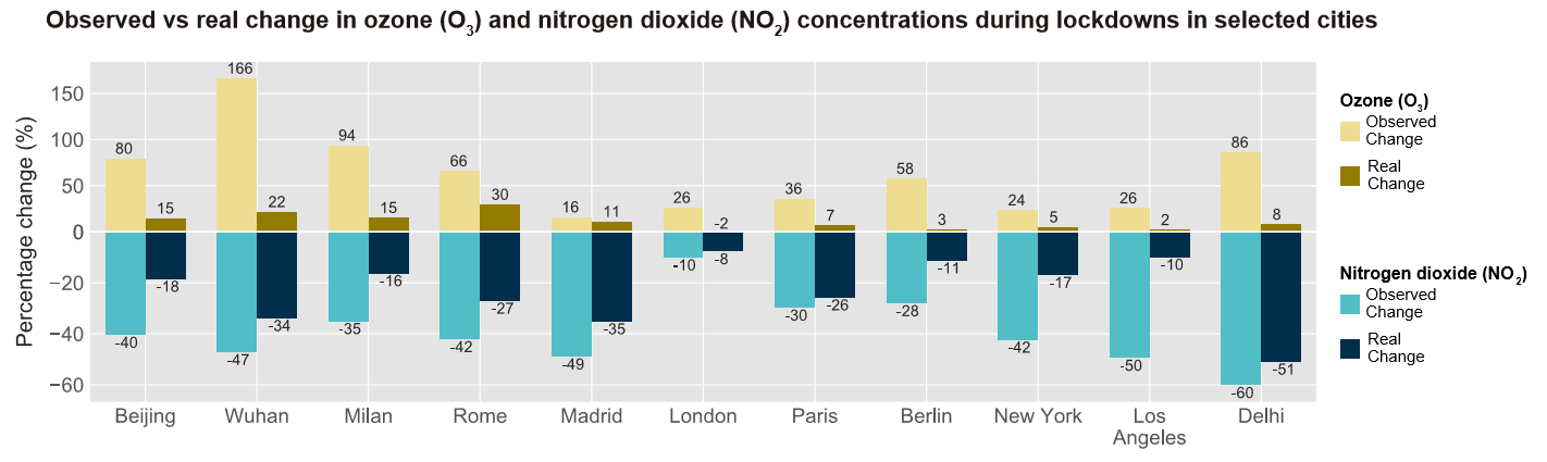 The authors considered all of these factors to calculate the degree to which changes in pollution levels observed in major cities in the spring of 2020 could be attributed to the introduction of lockdowns.