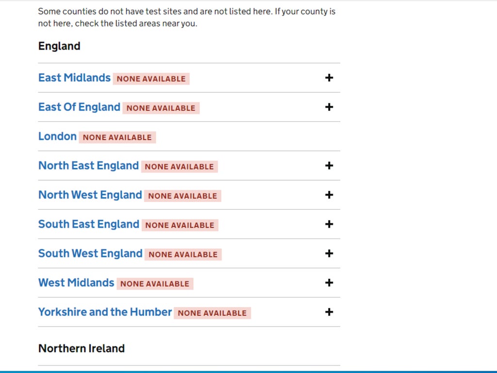 The website lists different regions of the UK to show the availability of supply in test sites in each area. By 12:30pm most regions were showing PCR tests “available” but some places, such as Hertfordshire, Suffolk and Mendip, were still showing they had no supply.