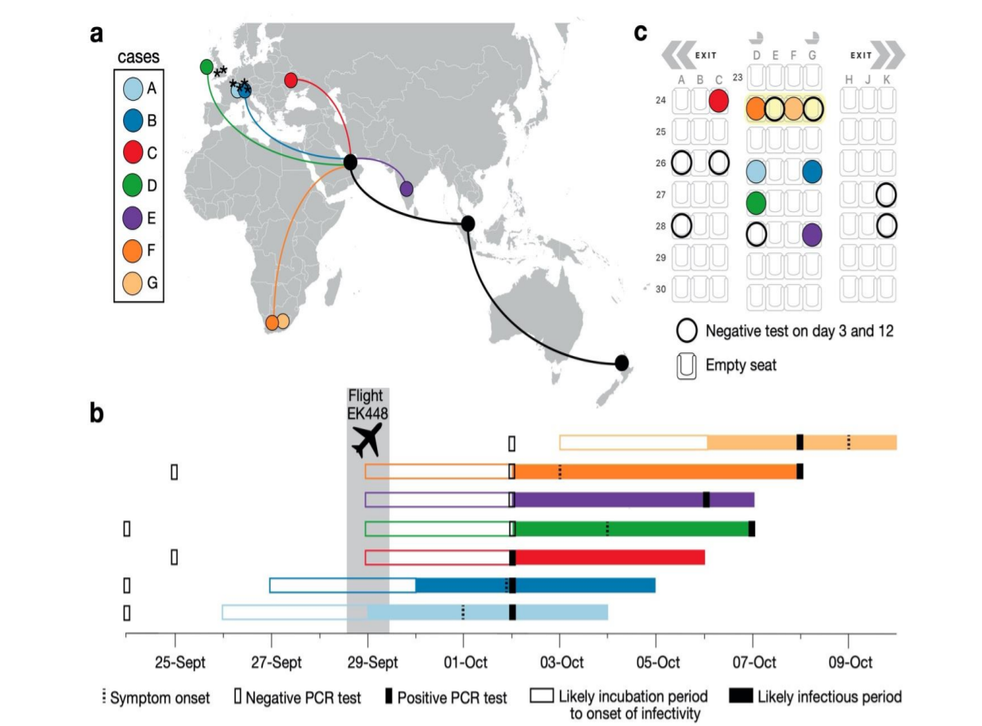 Based on the timeline of who exhibited symptoms when, the seating plan and genome sequencing of the virus, researchers posited that passengers A and/or B were likely to have carried the virus on board.