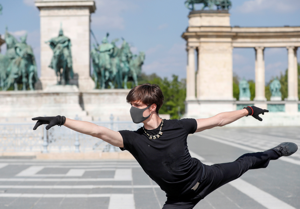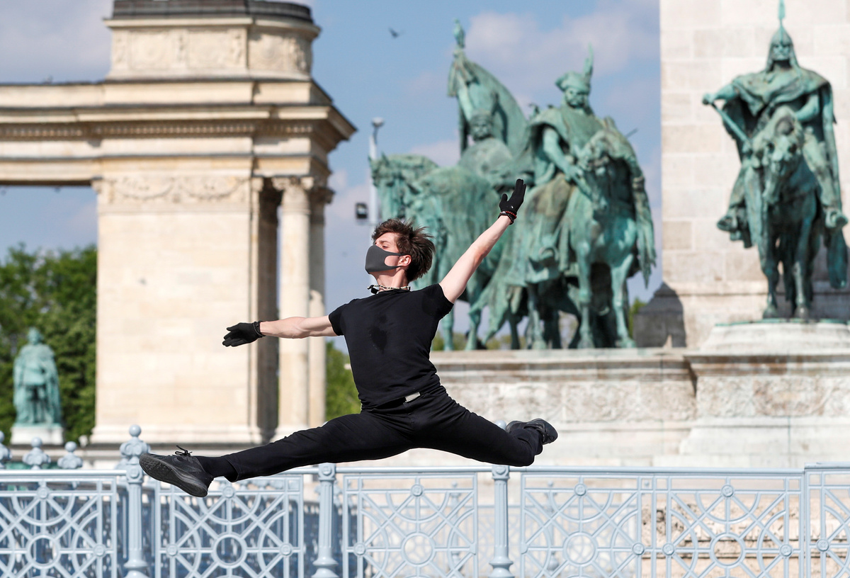 Dressed in black and wearing a facemask, the dancer leaps and pirouttes across Budapest's deserted central Heroes Square - to the strains of a melody that mirrors the molecular structure of the coronavirus.