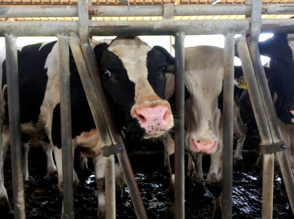 At the farm on Friday, black cows stood ankle-deep in mud under hangers as workers unloaded bags of grass from tractors.