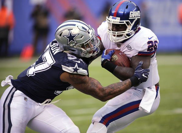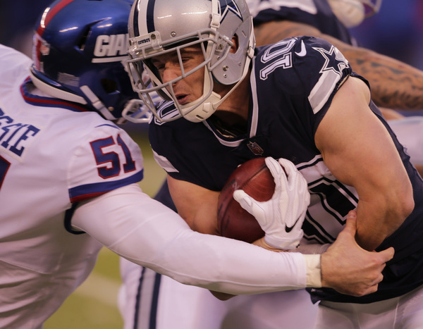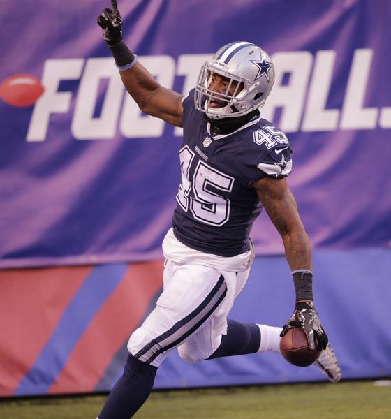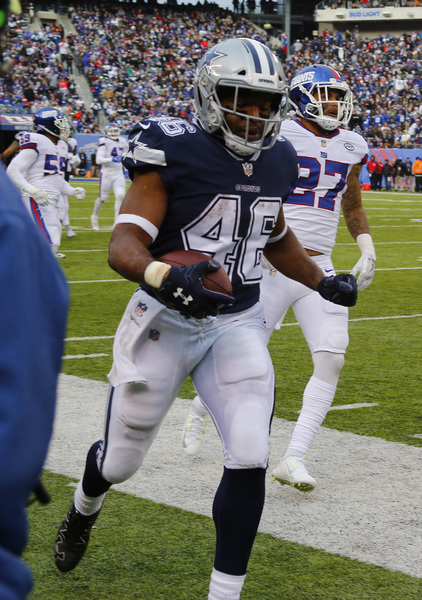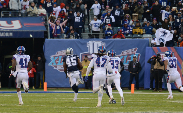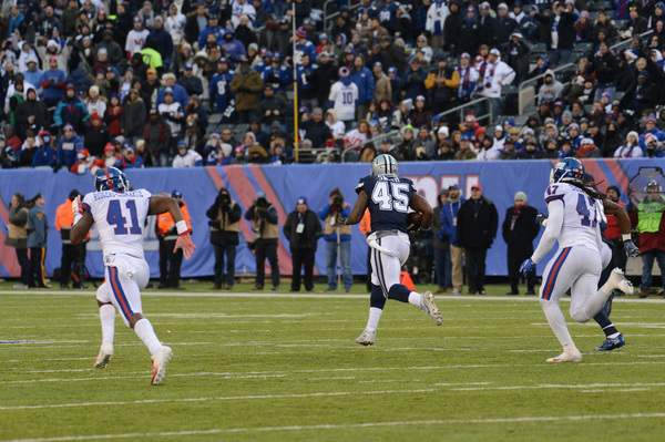 He then followed with a 15-yard touchdown run after linebacker Sean Lee intercepted an Eli Manning pass.