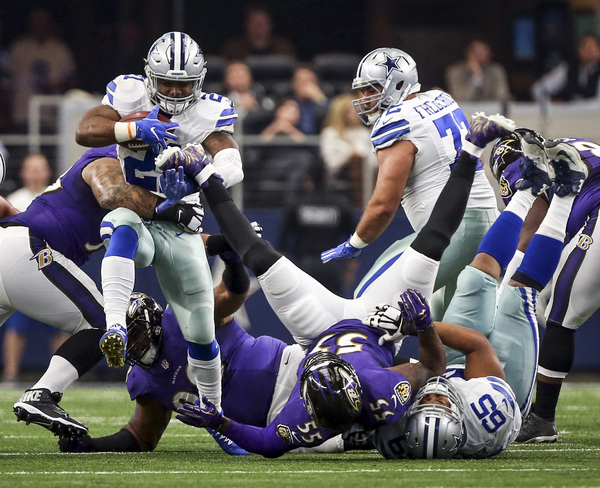 It was soon first and 30 from the 28 after a block in the back penalty on center Travis Frederick and a holding penalty on tackle Tyron Smith on back-to-back plays.