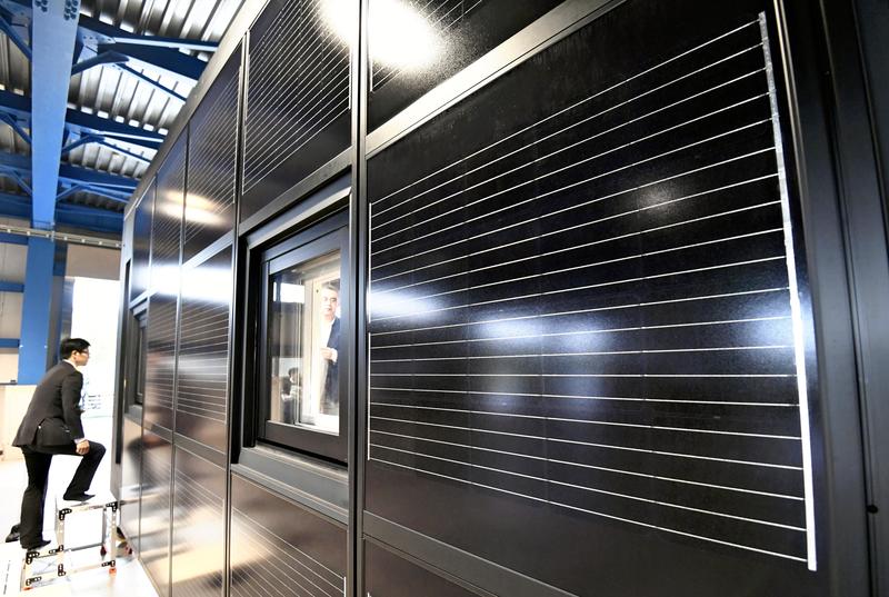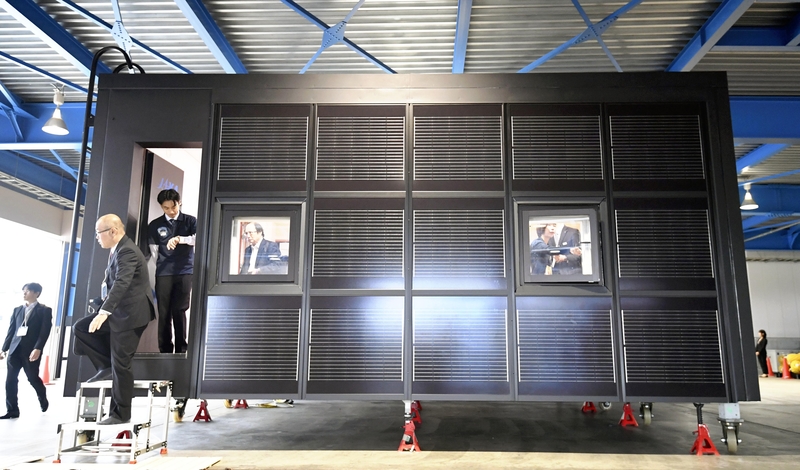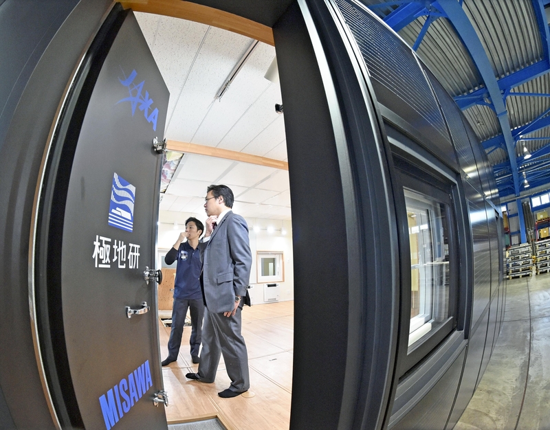 An mobile station unit is displayed at the National Institute of Polar Research in Tachikawa, Tokyo on Tuesday. The unit was developed by the institute and other entities such as the Japan Aerospace Exploration Agency and Misawa Homes Co. so researchers can live comfortably in the harsh environment of Antarctica. Six meters long, six meters wide and three meters high, the unit will be set up at the Showa Station in Antarctica for experiments next year. There are hopes of using the data obtained in the design of a lunar base.