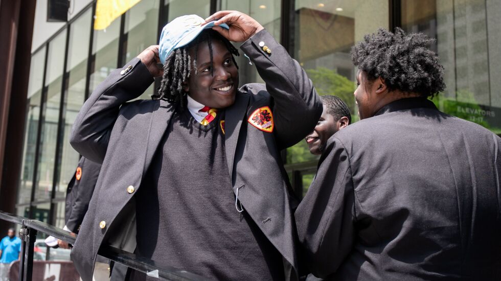 As a 14-year-old freshman, Moore remembers how hard it was to adjust to the new rules and rituals at Urban Prep. The students wear blue blazers, red ties and khaki pants. They recite the Urban Prep creed every morning.