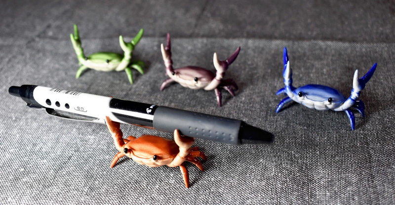The crab-shaped pen holders are made out of resin and come in a choice of red, blue, green or beige.