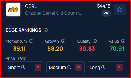 Benzinga's Edge Rankings place Cracker Barrel in the 39th percentile for momentum and the 58th percentile for growth, reflecting its average performance in both areas. Check the detailed report here.