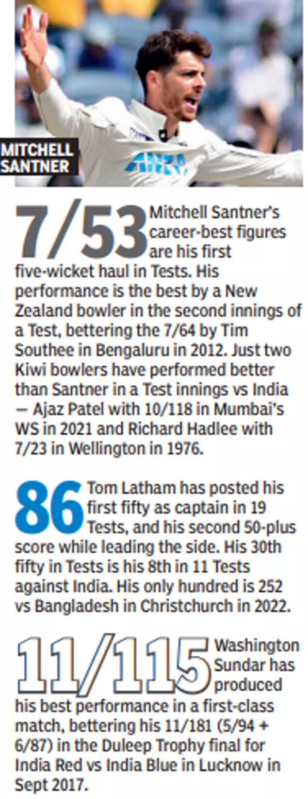 Santner bettered Washington Sundar's haul of 7-59 with his own 7-53. Like Washington, he was not a part of the previous Test. Now both have recorded their best-ever figures. Santner bowled unchanged for more than 19 overs in the morning session. The 32-year-old, playing his 29th Test in nine years, was rewarded for his maturity, change of pace and variation in length.