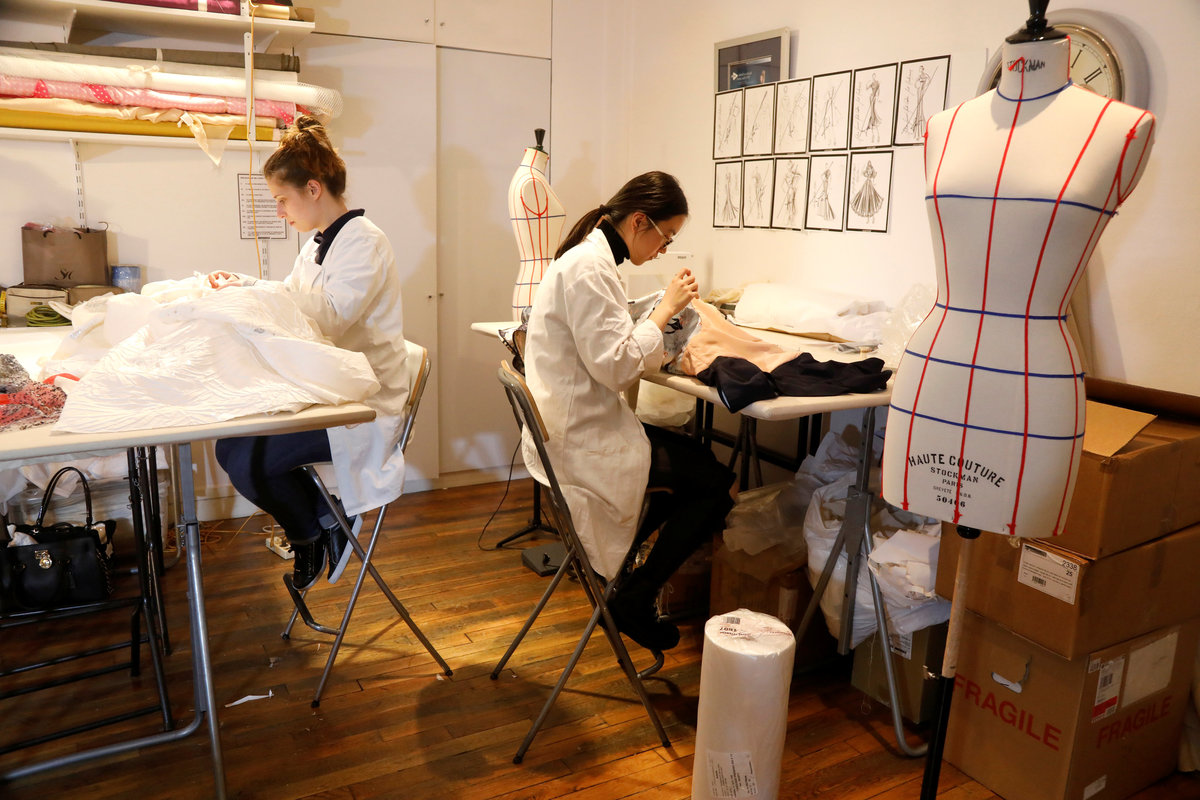 Seamstresses work at the Maison Julien Fournie workshop ahead of his Spring-Summer 2018 Haute Couture fashion show presentation in Paris, France, January 15, 2018. Picture taken January 15, 2018. REUTERS/Charles Platiau