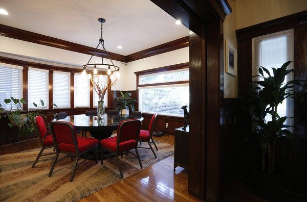 The home was built in 1910 and features classic Craftsman details such as exposed ceiling beams, original crown molding, double-hung windows, and built-in cabinets.