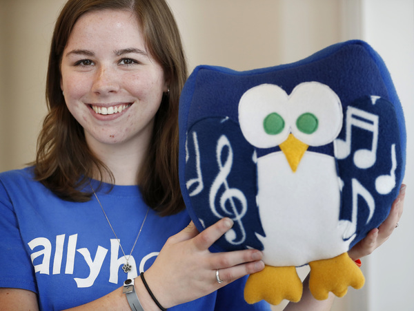 After Doucette gave up track, her parents got her a sewing machine. She learned fast, and designed an owl-shaped pillow she dubbed the Allyhoo. She made 10 brightly colored, cuddly creatures, and donated them to Children's.