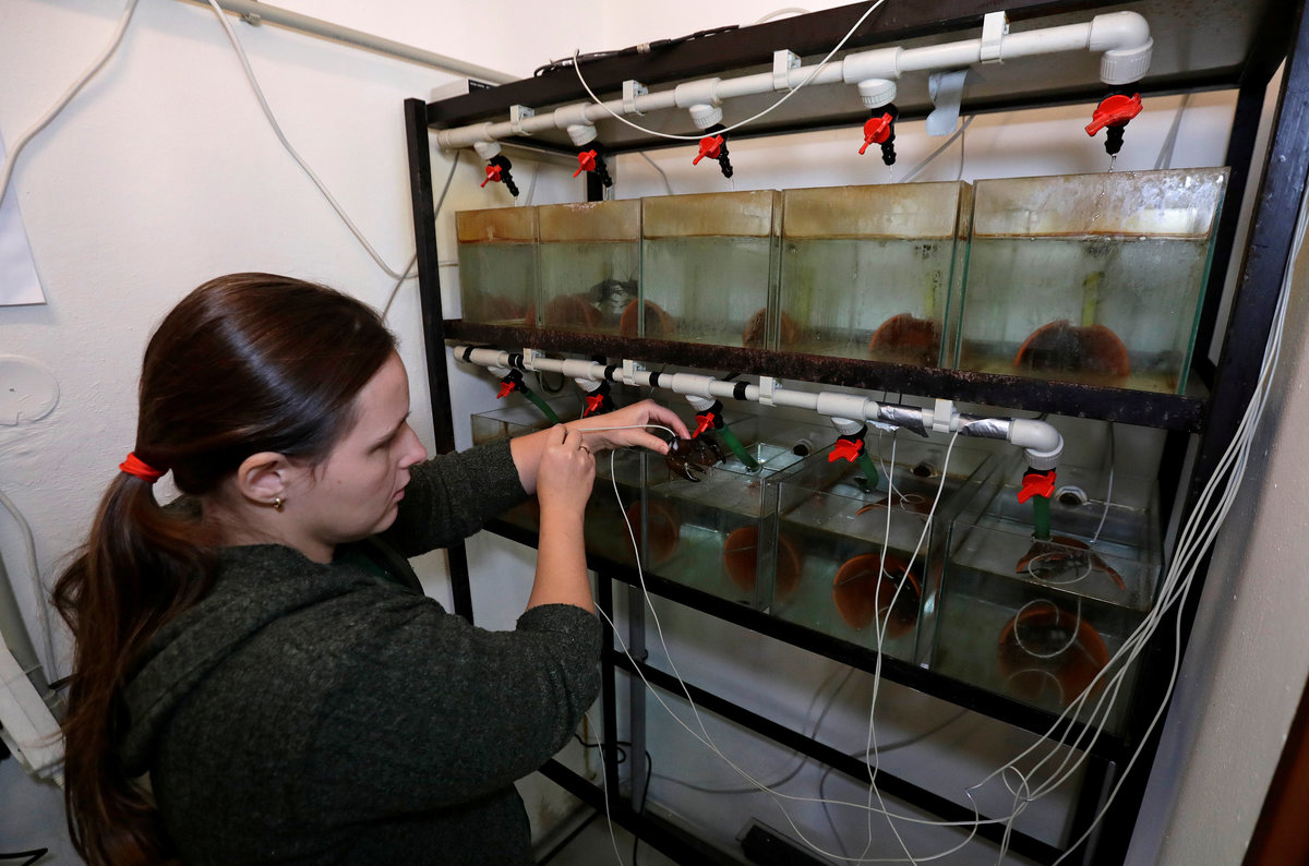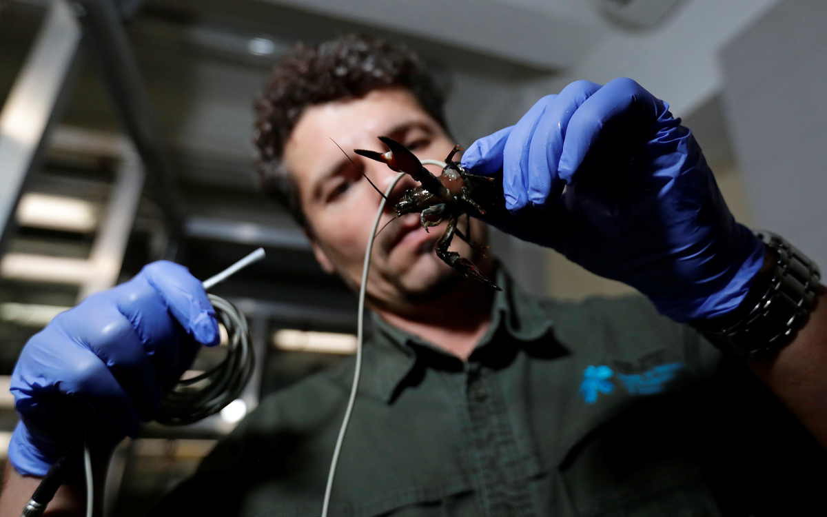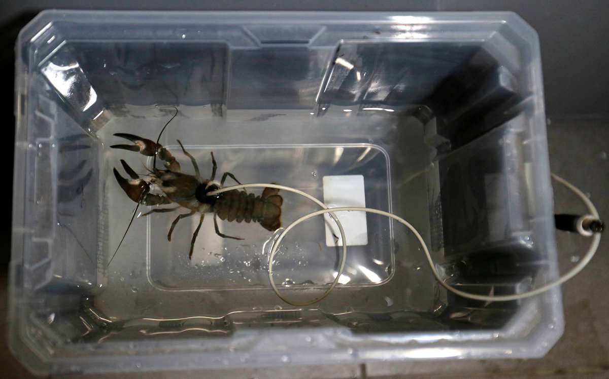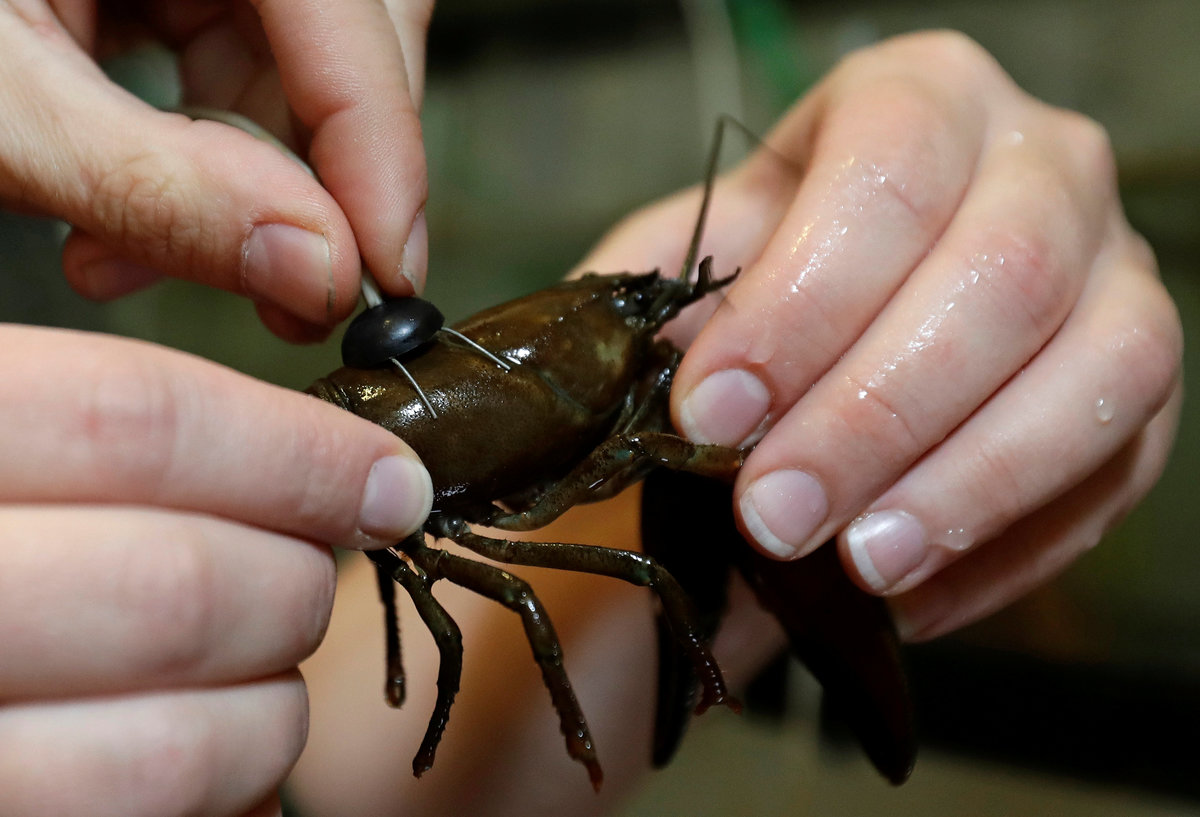 A scientist from the Faculty of Fisheries and Protection of Waters places a crayfish, equipped with a sensor, to a fish tank in Protivin brewery in Protivin, Czech Republic, September 26, 2017. Picture taken September 26, 2017. REUTERS/David W Cerny