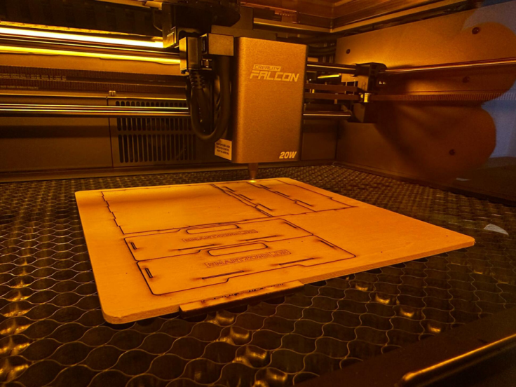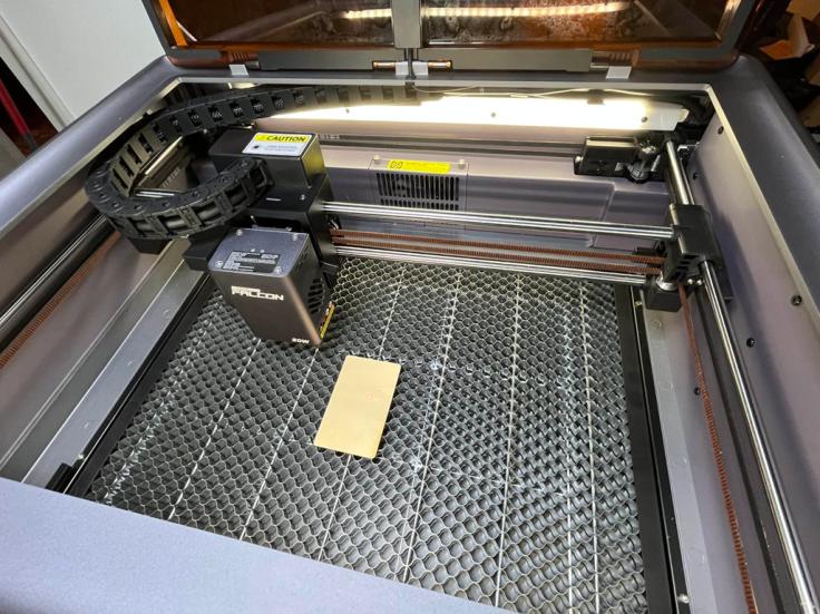 The blue laser handles standard materials effectively across the available work area. Three-millimeter basswood cuts cleanly at 520mm/min using 90% power in single passes. The 0.08x0.10mm focused spot produces detail suitable for precise engraving and cutting work.