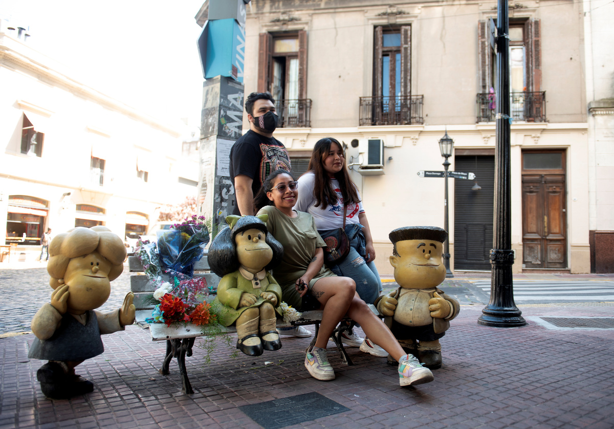 People pose for a picture next to sculptures of comic characters Mafalda (C), Susanita (L), and Manolito, created by cartoonist Joaquin Salvador Lavado, also known as Quino, who died today at the age of 88, in Buenos Aires, Argentina September 30, 2020. REUTERS/Manuel Cortina
