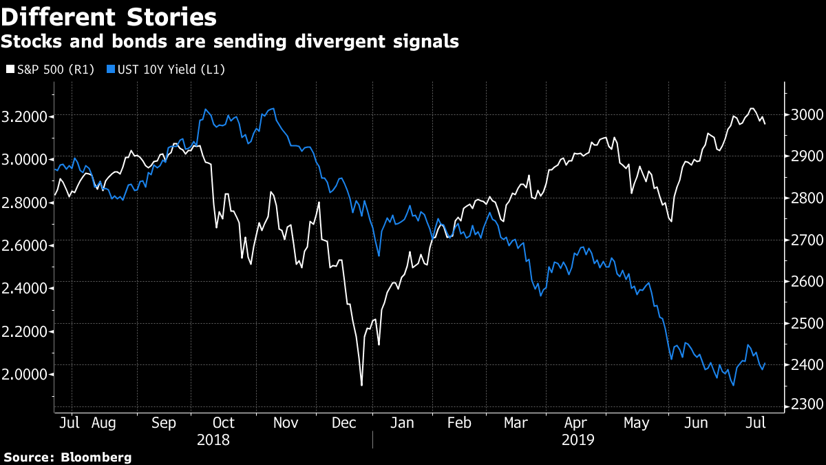 In the stock market, optimism about Federal Reserve interest-rate cuts has sent prices higher. While in bonds, the narrative is one of concern about a lasting economic downturn, she said.