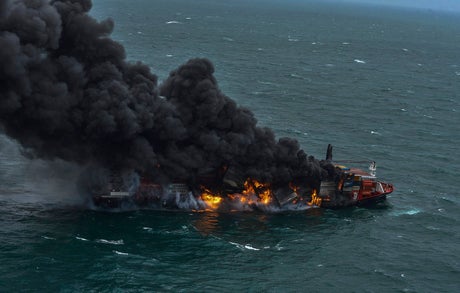 Aerial photos released by Sri Lanka's air force showed the vessel engulfed in flames and thick smoke. High winds intensified the blaze, Silva said.