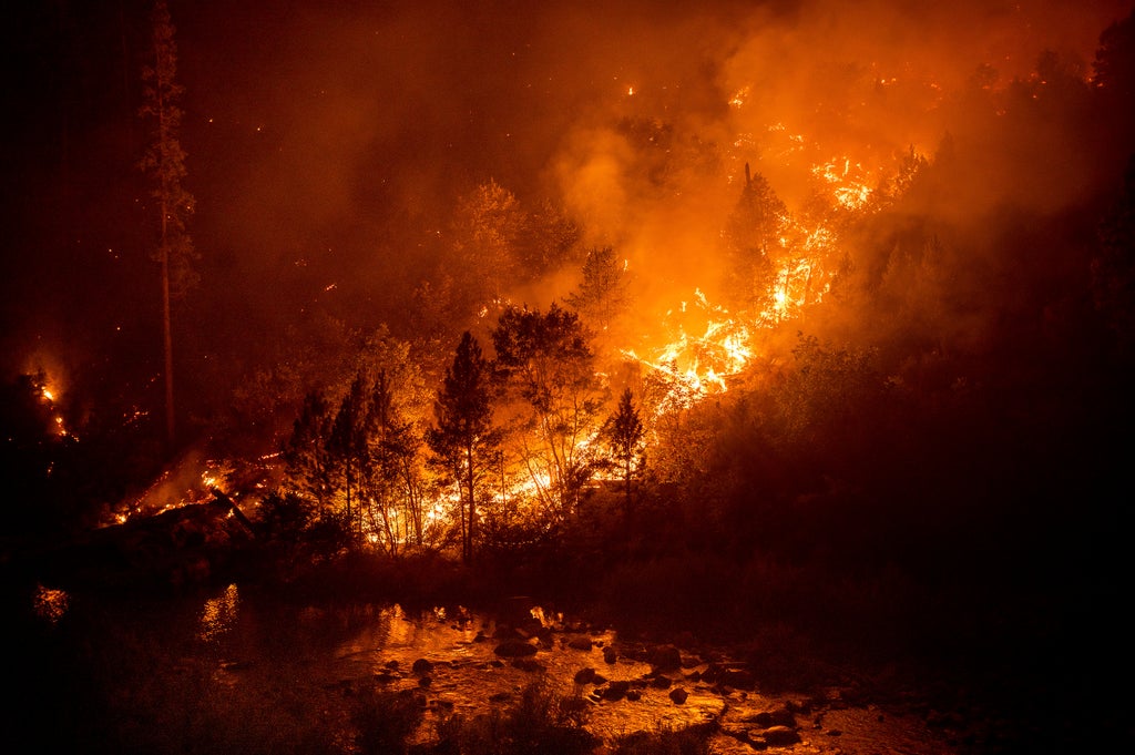The fire’s eastern edge was about 7 or 8 miles (11 or 13 kilometers) from the city of South Lake Tahoe and did not advance much overnight thanks to operations known as “backfiring,” where firefighters get ahead of the blaze and burn up fuel so the fire has nothing to ignite, said Horner.
