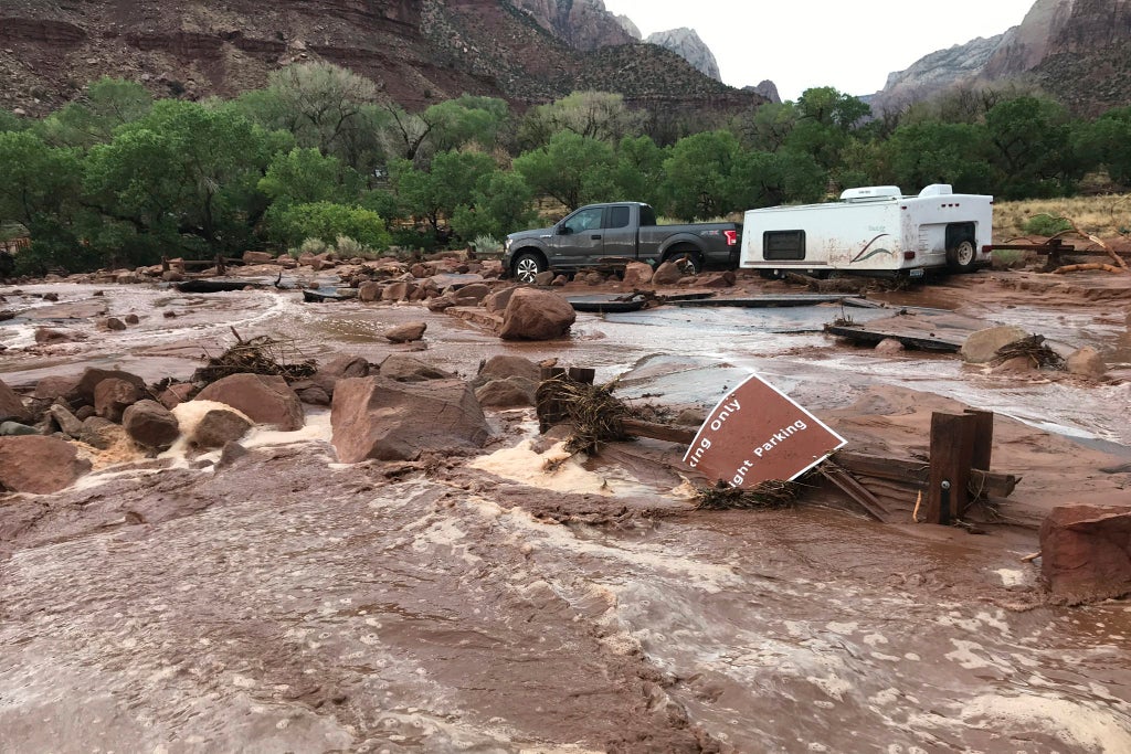 When the rain started, Stacy Cathey and her husband, Rodney Smith, of Atlanta who were visiting the park with another couple, were in a van in a parking lot at the entrance Springdale, which they said filled up like a swimming pool within about 20 minutes, KSTU-TV reported.