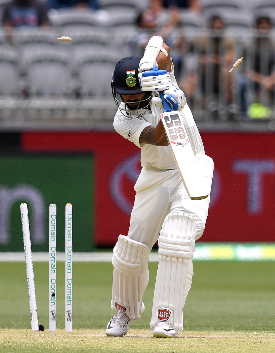 Pujara, who was India's hero in the first test with scores of 123 and 71, fell tamely for a hard-fought 24 when he was caught behind feathering a Starc delivery down the leg side.