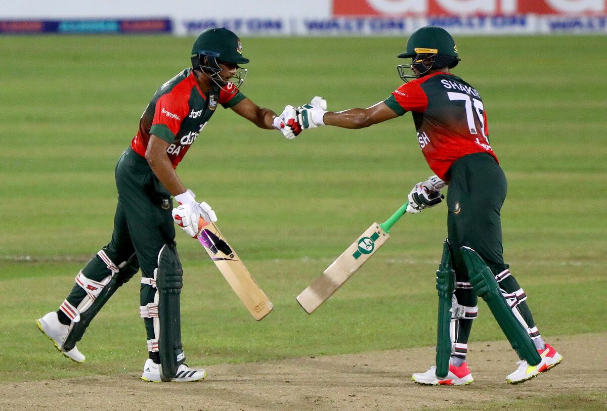 Cricket - Third Twenty20 International - Bangladesh v Australia - Sher-e-Bangla National Cricket Stadium, Dhaka, Bangladesh - August 6, 2021. Bangladesh's captain Mahmudullah and Shakib Al Hasan fist bumps. REUTERS/Mohammad Ponir HossainCricket - Second Twenty20 International - Bangladesh v Australia - Sher-e-Bangla National Cricket Stadium, Dhaka, Bangladesh - August 4, 2021. Australia's Andrew Tye celebrates with his teammates after taking the wicket of Bangladesh?s Shakib Al Hasan. REUTERS/Mohammad Ponir Hossain