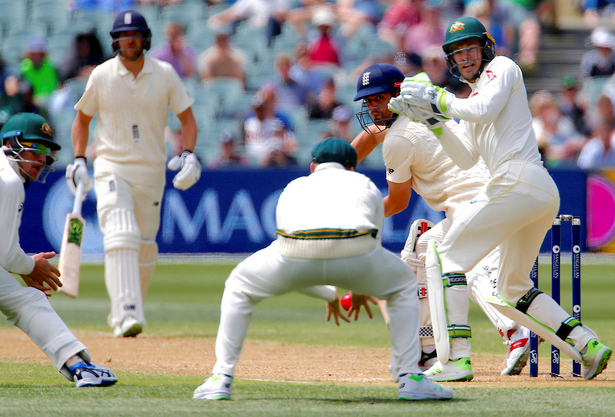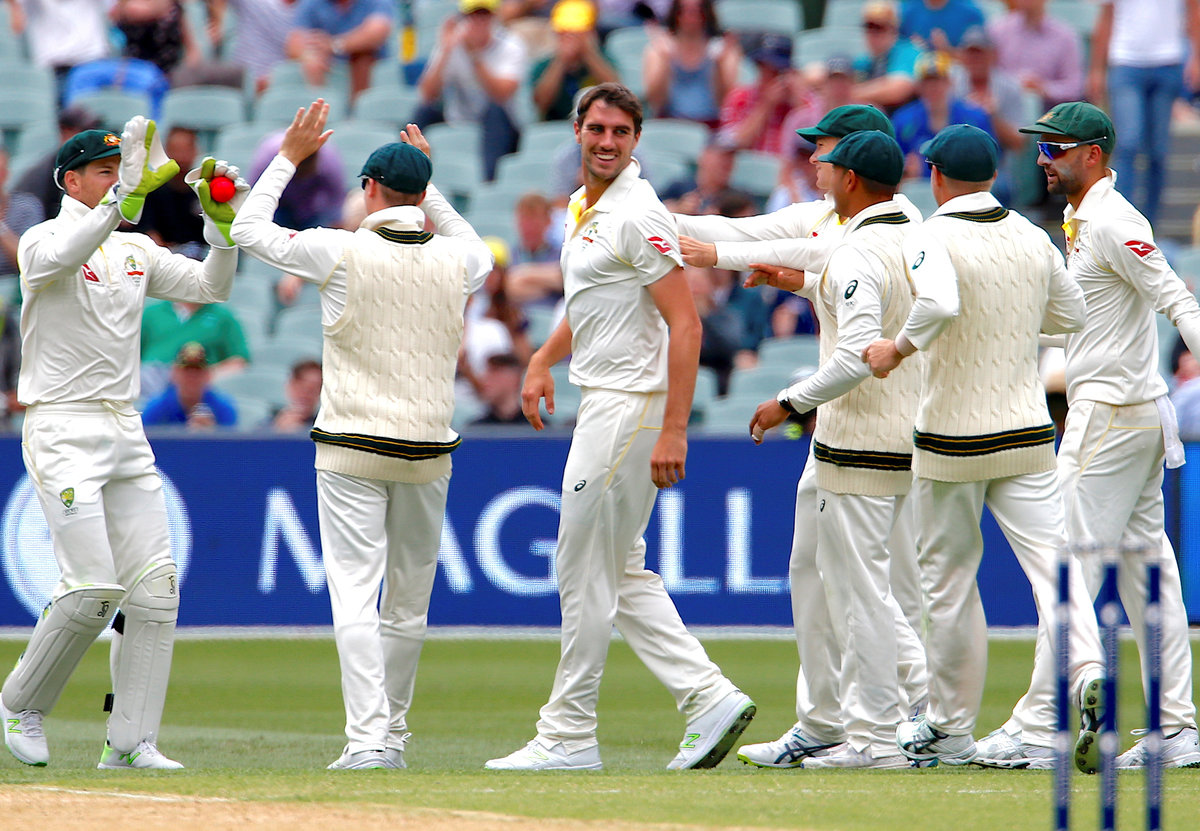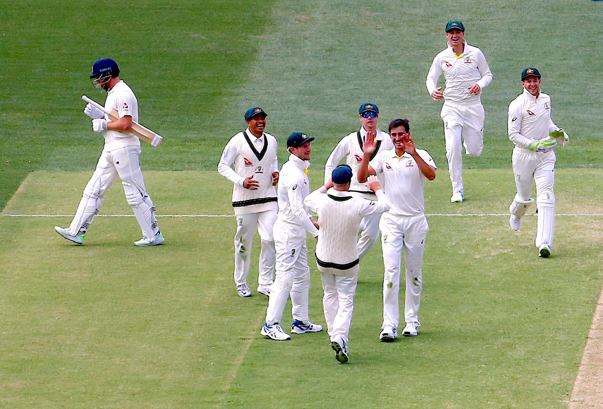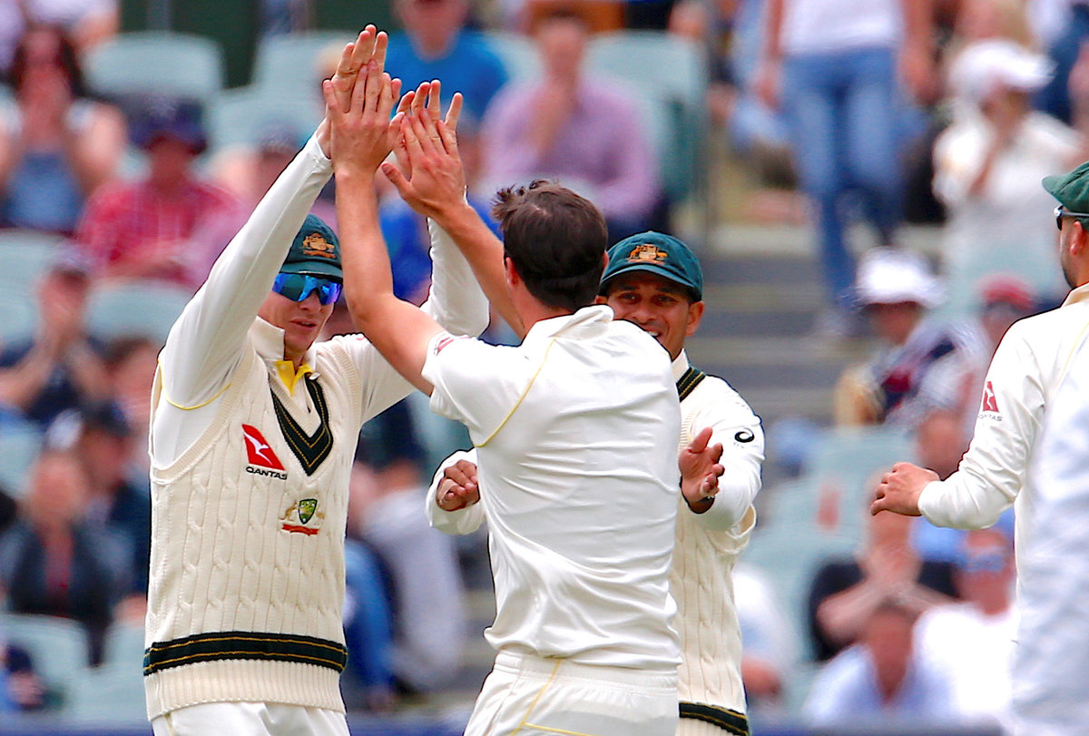 Cricket - Ashes test match - Australia v England - Adelaide Oval, Adelaide, Australia, December 4, 2017. England's Craig Overton reacts as he hits a delivery from Australia's Mitchell Starc during the third day of the second Ashes cricket test match. REUTERS/David GrayCricket - Ashes test match - Australia v England - Adelaide Oval, Adelaide, Australia, December 4, 2017. Australia's Nathan Lyon celebrates with team mates after dismissing England's Alastair Cook during the third day of the second Ashes cricket test match. REUTERS/David GrayCricket - Ashes test match - Australia v England - Adelaide Oval, Adelaide, Australia, December 4, 2017. Australia's Pat Cummins celebrates with team mates after he dismissed England's Dawid Malan during the third day of the second Ashes cricket test match. REUTERS/David GrayCricket - Ashes test match - Australia v England - Adelaide Oval, Adelaide, Australia, December 4, 2017. England's Jonny Bairstow avoids a short delivery from Australia's Pat Cummins during the third day of the second Ashes cricket test match. REUTERS/David GrayCricket - Ashes test match - Australia v England - Adelaide Oval, Adelaide, Australia, December 4, 2017. England's Dawid Malan reacts as he walks off the field after being dismissed during the third day of the second Ashes cricket test match. REUTERS/David GrayCricket - Ashes test match - Australia v England - Adelaide Oval, Adelaide, Australia, December 4, 2017. Australia's captain Steve Smith celebrates with team mate Pat Cummins after he dismissed England's Dawid Malan during the third day of the second Ashes cricket test match. REUTERS/David GrayCricket - Ashes test match - Australia v England - Adelaide Oval, Adelaide, Australia, December 4, 2017. Australia's captain Steve Smith celebrates with team mate Pat Cummins after he dismissed England's Dawid Malan during the third day of the second Ashes cricket test match. REUTERS/David Gray