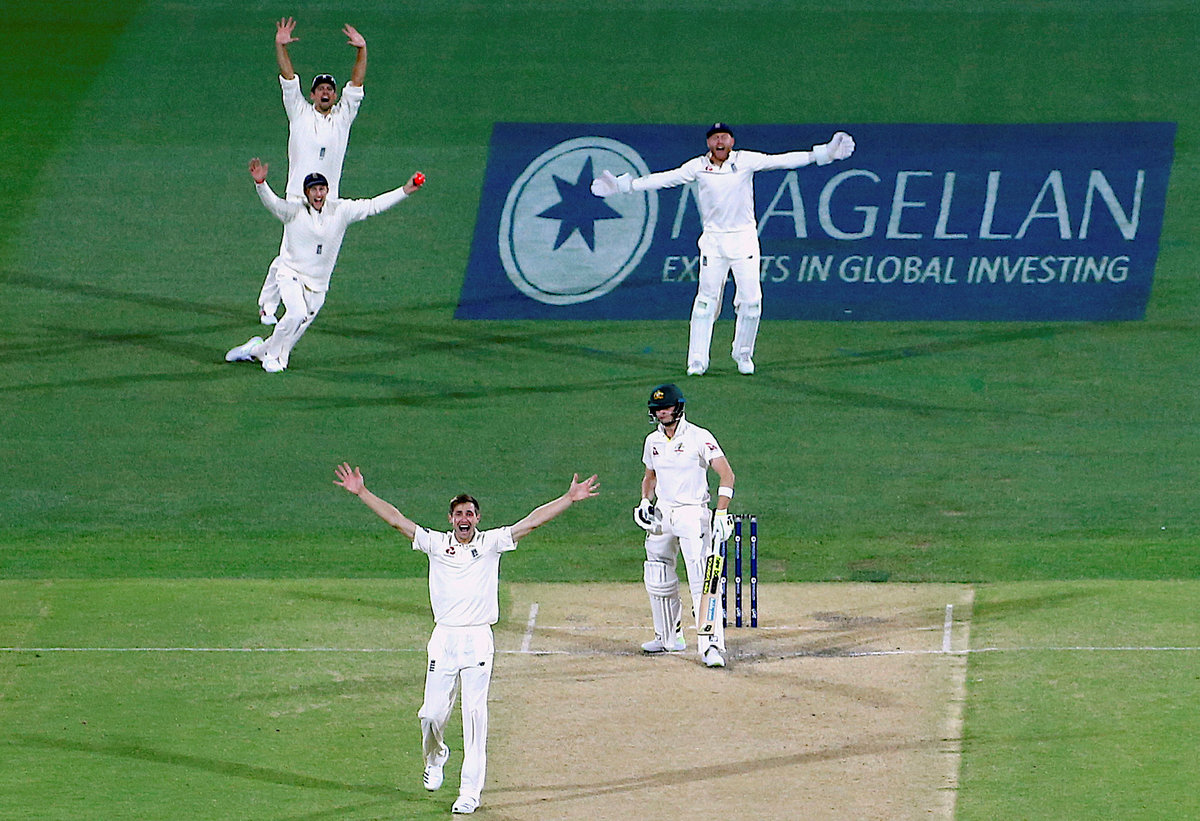 Cricket - Ashes test match - Australia v England - Adelaide Oval, Adelaide, Australia, December 4, 2017. England's Chris Woakes appeals successfully for LBW to dismiss Australia's captain Steve Smith during the third day of the second Ashes cricket test match. REUTERS/David Gray