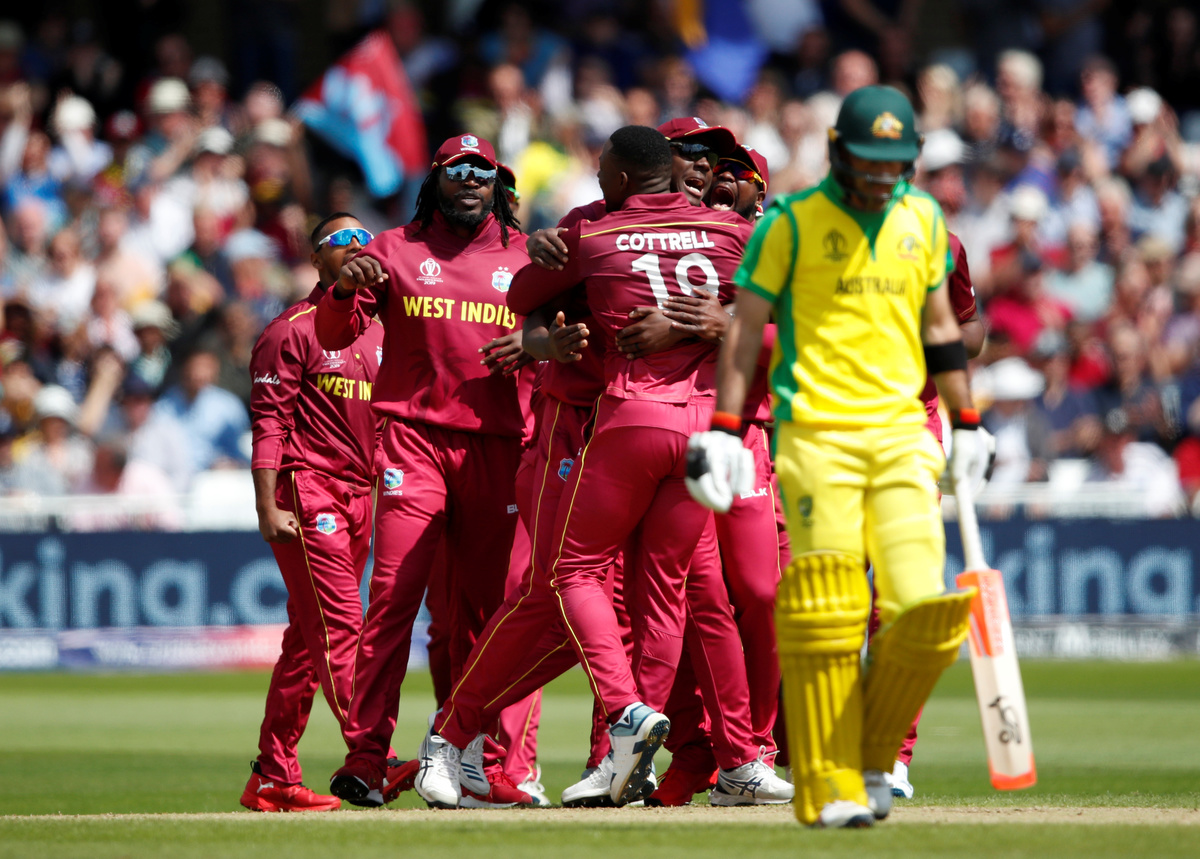 Cricket - ICC Cricket World Cup - Australia v West Indies - Trent Bridge, Nottingham, Britain - June 6, 2019 Australia's Steve Smith looks dejected as he walks off the pitch after his wicket is taken by West Indies' Oshane Thomas Action Images via Reuters/Andrew BoyersCricket - ICC Cricket World Cup - Australia v West Indies - Trent Bridge, Nottingham, Britain - June 6, 2019 West Indies' Chris Gayle in action Action Images via Reuters/Andrew BoyersCricket - ICC Cricket World Cup - Australia v West Indies - Trent Bridge, Nottingham, Britain - June 6, 2019 West Indies' Sheldon Cottrell celebrates with Chris Gayle and team mates after catching out Australia's Steve Smith Action Images via Reuters/Andrew BoyersCricket - ICC Cricket World Cup - Australia v West Indies - Trent Bridge, Nottingham, Britain - June 6, 2019 Australia's Nathan Coulter-Nile in action Action Images via Reuters/Andrew BoyersCricket - ICC Cricket World Cup - Australia v West Indies - Trent Bridge, Nottingham, Britain - June 6, 2019 Australia's Alex Carey scores a four Action Images via Reuters/Andrew BoyersCricket - ICC Cricket World Cup - Australia v West Indies - Trent Bridge, Nottingham, Britain - June 6, 2019 West Indies' Jason Holder catches to ball to dismiss Australia's Mitchell Starc Action Images via Reuters/Andrew BoyersCricket - ICC Cricket World Cup - Australia v West Indies - Trent Bridge, Nottingham, Britain - June 6, 2019 West Indies' Andre Russell celebrates taking the wicket of Australia's Usman Khawaja Action Images via Reuters/Andrew BoyersCricket - ICC Cricket World Cup - Australia v West Indies - Trent Bridge, Nottingham, Britain - June 6, 2019 Australia's Glenn Maxwell walks off the pitch after his wicket is taken by West Indies' Sheldon Cottrell Action Images via Reuters/Andrew Boyers