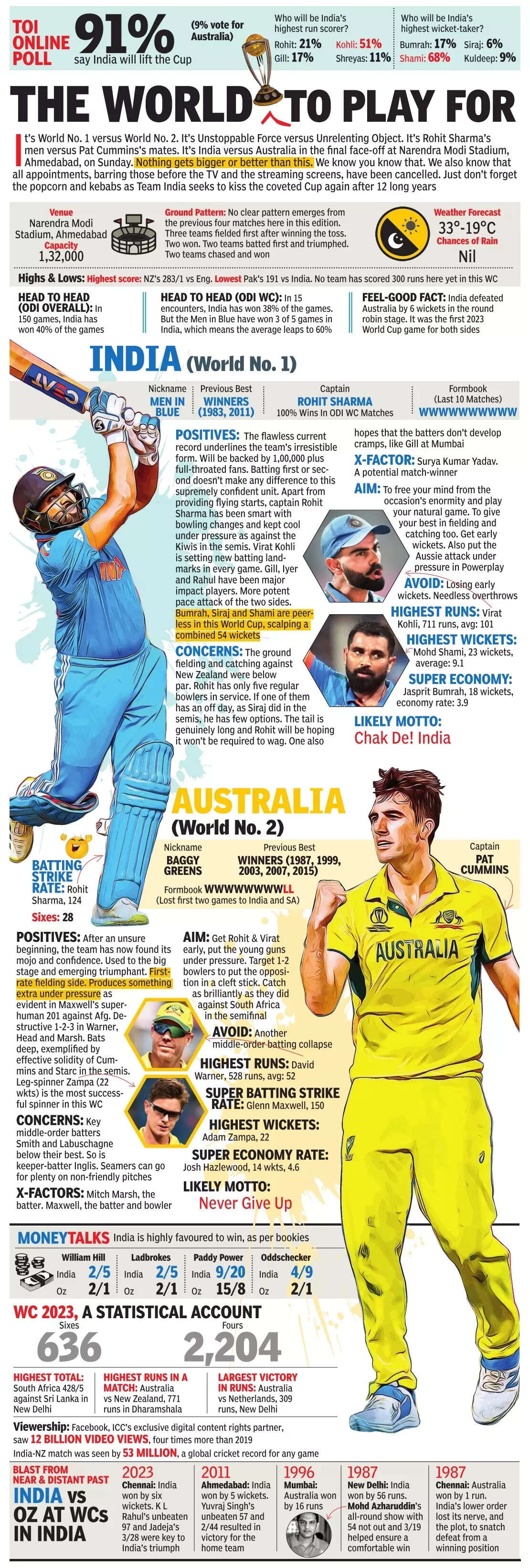 After losing the toss, India captain Rohit Sharma said, "I would have batted first. Looks a good pitch, big game, put runs on the board. It's going to be amazing, every time we play here, the crowd come out in large numbers. The biggest occasion in the cricketing event. We have to stay nice and calm. It's a dream come true to be captaining the team in the final. I know what lies in front of us. We need to play well and get the result. You got to make the right decisions on the field. That's something we've done consistently in the last 10 games. We are playing the same team."