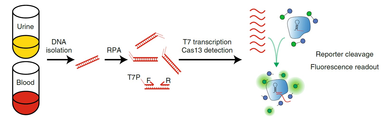 Abstract: In organ transplantation, infection and rejection are major causes of graft loss. They are linked by the net state of immunosuppression. To diagnose and treat these conditions earlier, and to improve long-term patient outcomes, refined strategies for the monitoring of patients after graft transplantation are needed. Here, we show that a fast and inexpensive assay based on CRISPR–Cas13 accurately detects BK polyomavirus DNA and cytomegalovirus DNA from patient-derived blood and urine samples, as well as CXCL9 messenger RNA (a marker of graft rejection) at elevated levels in urine samples from patients experiencing acute kidney transplant rejection. The assay, which we adapted for lateral-flow readout, enables—via simple visualization—the post-transplantation monitoring of common opportunistic viral infections and of graft rejection, and should facilitate point-of-care post-transplantation monitoring.