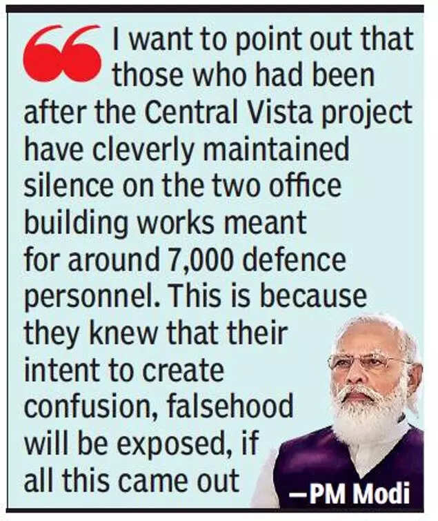 I want to point out that those who had been after the Central Vista project have cleverly maintained silence on these two office building works meant for 7,000 defence personnel. This is because they knew their intent to create confusion, falsehood will be exposed, if all this came out,” said the PM, breaking the silence he had maintained over the Central Vista project even as an intense battle was fought over it inside the courts and in the wider public arena.