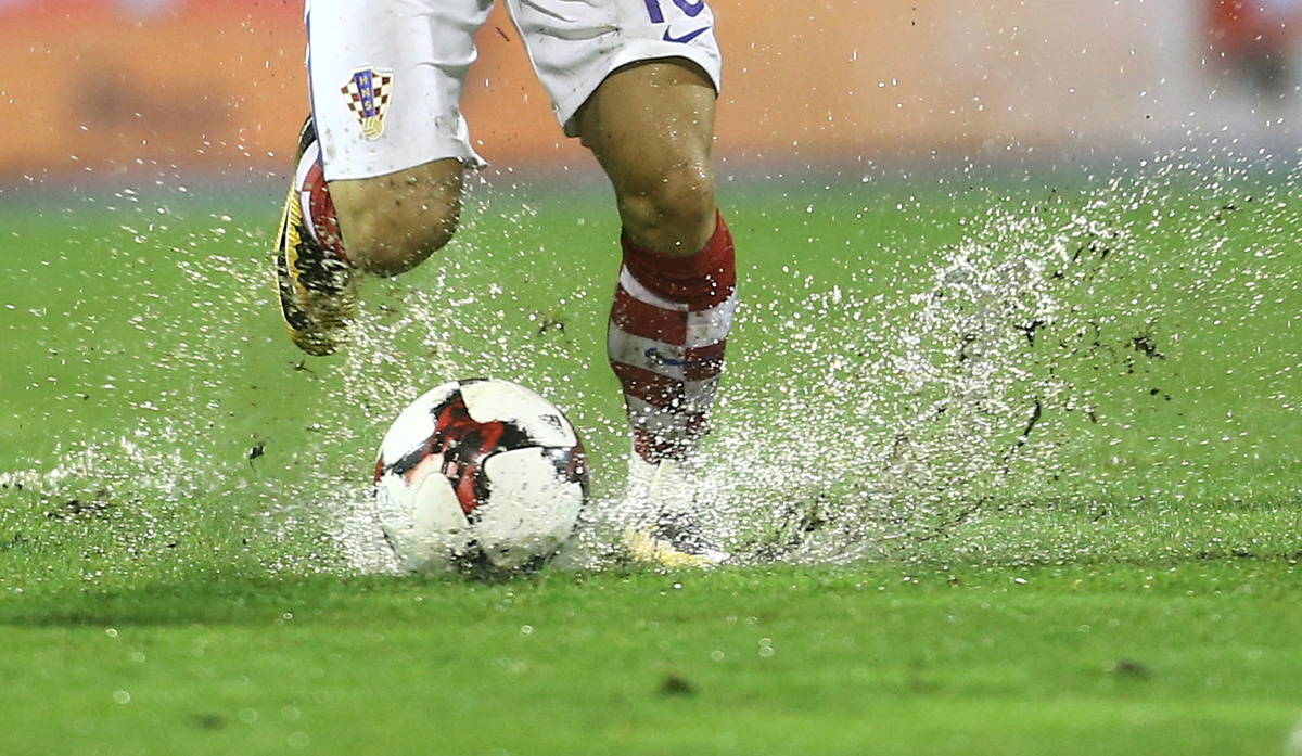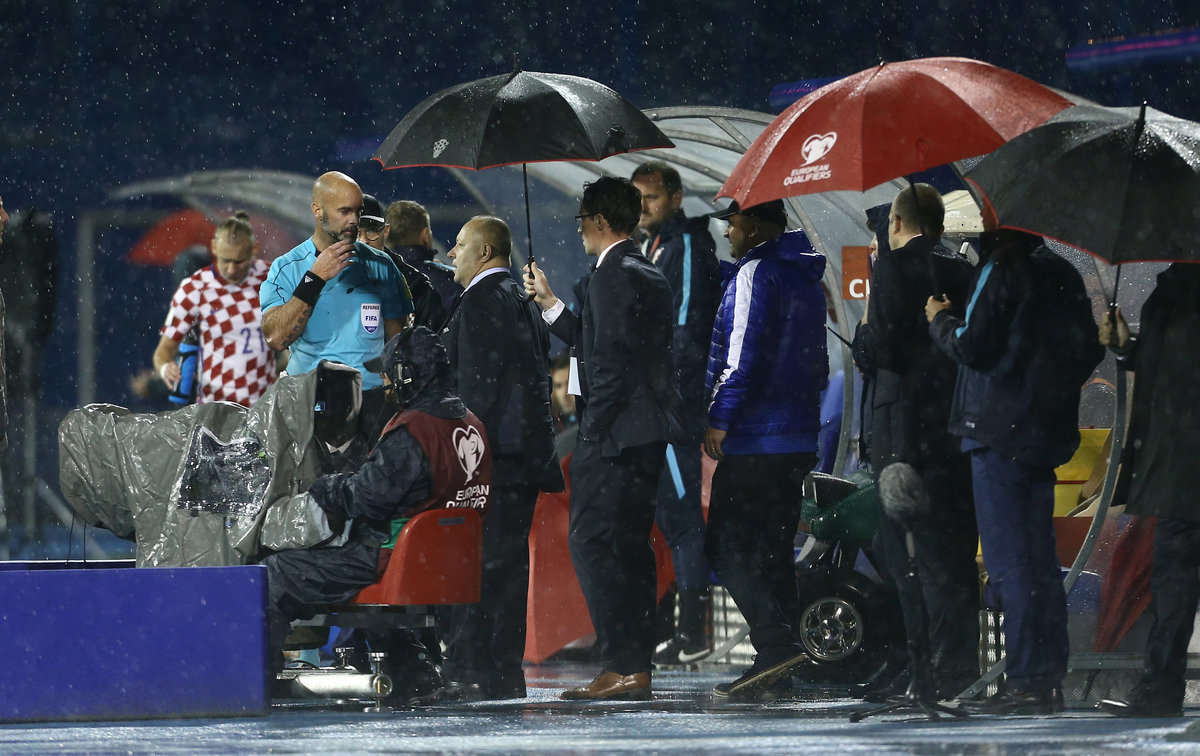 Players found it almost impossible to control the ball in Dinamo's Maksimir stadium, with huge puddles all over the surface making it unplayable and causing dangerous skidding which could have led to serious injuries.