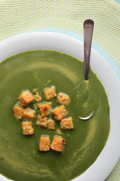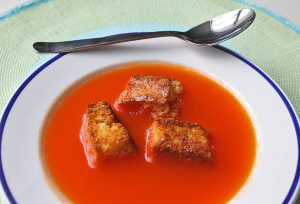 Root vegetables, as it turns out, make excellent croutons. I cut a sweet potato into a dice, tossed the pieces in olive oil and then lightly coated them in bread crumbs. Then I roasted them in the oven until they were tender.