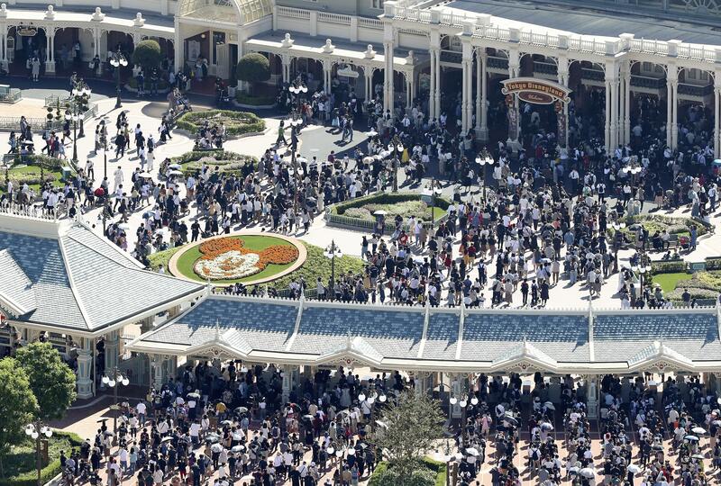 At Tokyo Disneyland in Chiba Prefecture, which has doubled its daily maximum number of visitors from 5,000 to 10,000, families lined up in the morning waiting to enter the park.