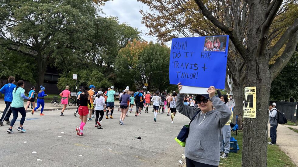 Some spectators went with the traditional “You can do it” or “Go, go, go” signs, but Stack and others got creative: “Run like Swifties to the NFL,” a reference to Taylor Swift’s rumored romance with Kansas City Chiefs tight end Travis Kelce.