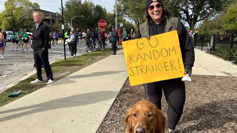 “We joke that we will never do it, but we will be here every year,” said Tiffany Gonzales, who watched the race with her golden retriever, Halsted, while holding her all-purpose sign: “Go random stranger!”