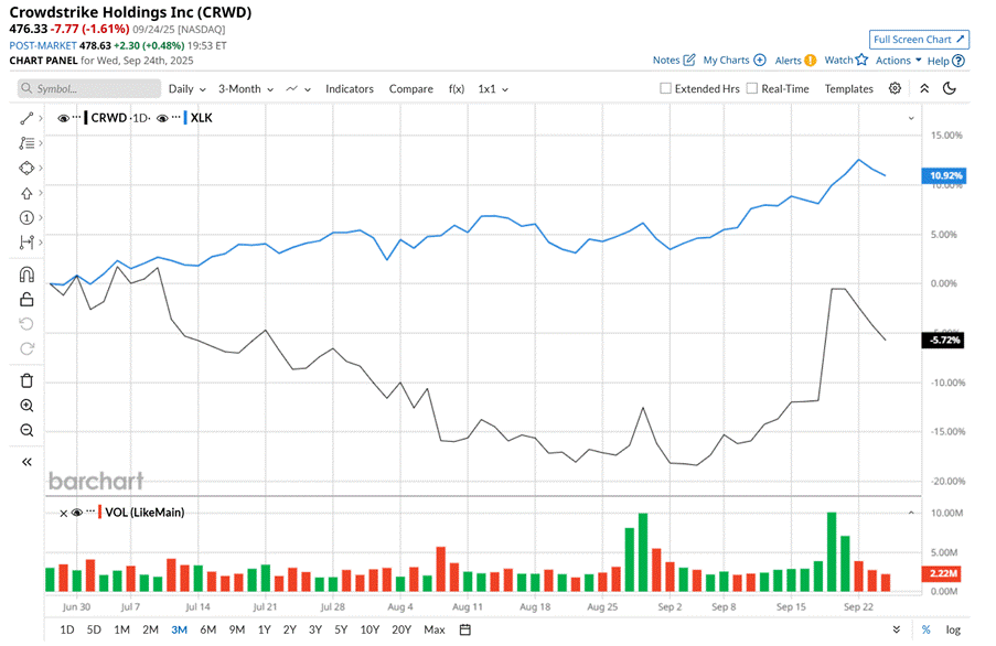 This cybersecurity company has slipped 8% from its 52-week high of $517.98, reached on Jul. 3. Shares of CRWD have declined 1.9% over the past three months, underperforming the Technology Select Sector SPDR Fund’s (XLK) 12.6% return during the same time frame.