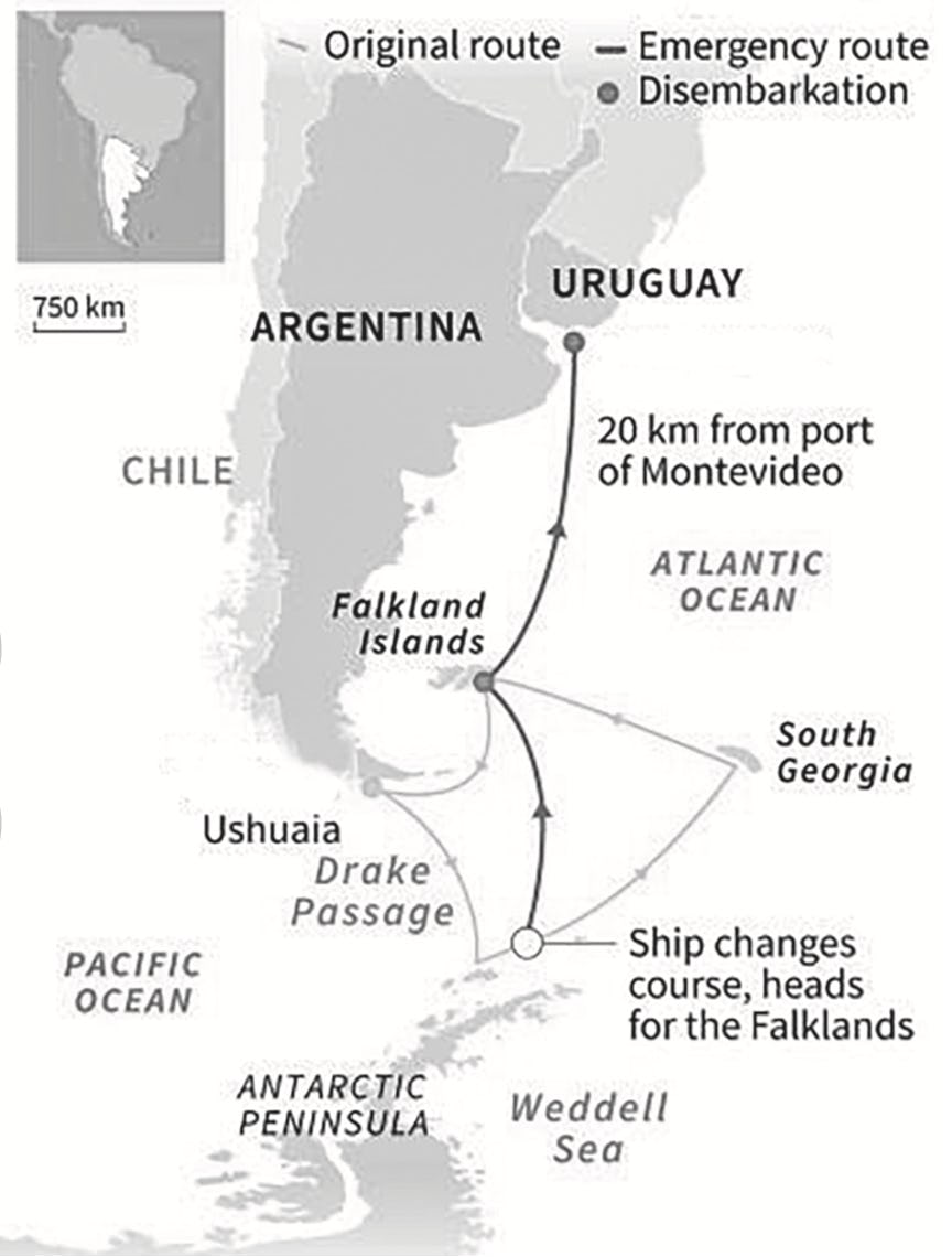 On day three, cruise authorities decided to cut the trip a week short due to newly announced international border controls and travel restrictions put in response to the Covid-19 pandemic. They planned to skip the South Georgia leg of the cruise and return back to Ushuaia on day 14.