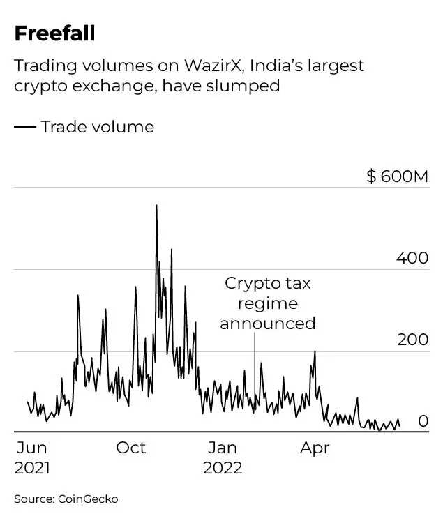 That a crypto marketplace should be in cost-cutting mode is hardly a surprise — Coinbase Global and Crypto.com have announced layoffs in the last two weeks alone — but exchanges in India face the added burden of a new tax system that executives fear will wipe out what little trading is left. WazirX’s daily volume has slumped about 95% since October, data from CoinGecko shows.