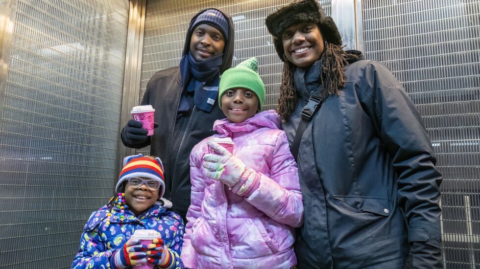 Later in the day, Jasmine and Matt Robinson stood under the heat lamps at the Washington/Wabash L stop with their two daughters, Alex, 9, and Sydney, 5.