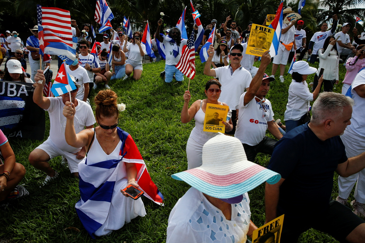 Demonstrators clad in white to show support for Cuban dissidents gathered in a park on Sunday in eastern Miami, and a collective prayer for the civil rights of Cubans was held later in the afternoon at Miami's Our Lady of Charity National Shrine, which honors the Roman Catholic patron of Cuba.