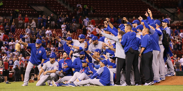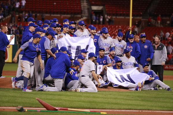 ST. LOUIS _ The Cubs clinched a tie for the National League Central title Monday night as they scored four runs in the first inning and coasted to a 10-2 victory over the rival Cardinals at Busch Stadium.
