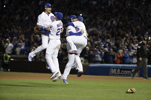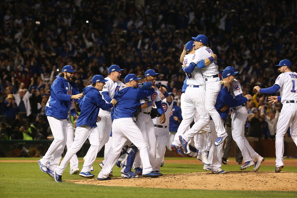 A throng of 42,386 rose to its feet when it became official on Yasiel Puig's double-play grounder. The Cubs stormed the pitcher's mound, the beginning of a party all those years in the making.